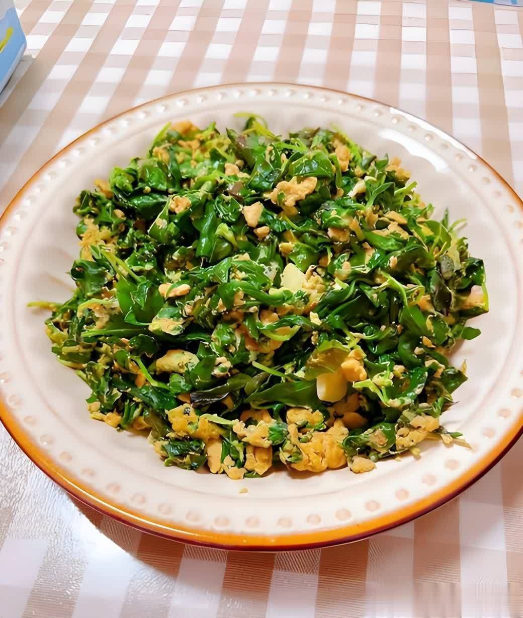6. 合并鸡蛋:将先前炒好的鸡蛋倒入锅中,与荆芥一同翻炒,确保鸡蛋与荆芥均匀混合。